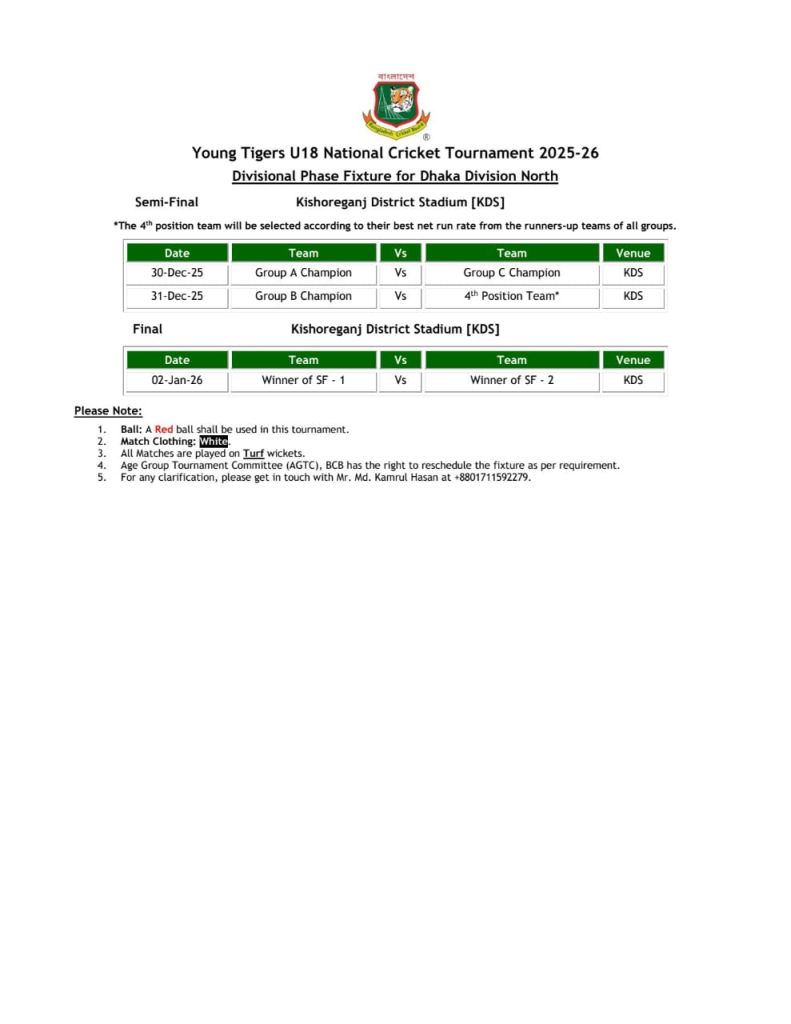 এছাড়া জেলা ক্রিকেট কর্মকর্তারা স্টেডিয়াম প্রস্তুতকরণে স্থানীয় গ্রাউন্ডসম্যান, স্বেচ্ছাসেবক ও খেলোয়াড়দের অবদানের প্রশংসা করেছেন। পিচ রক্ষণাবেক্ষণ ও মাঠ প্রস্তুত রাখতে গ্রাউন্ডসম্যানরা নিরলসভাবে কাজ করছেন এবং তরুণ ক্রিকেটাররাও পরিষ্কার-পরিচ্ছন্নতা ও অন্যান্য প্রস্তুতিমূলক কাজে অংশ নিয়ে তাদের দায়বদ্ধতার পরিচয় দিচ্ছেন।